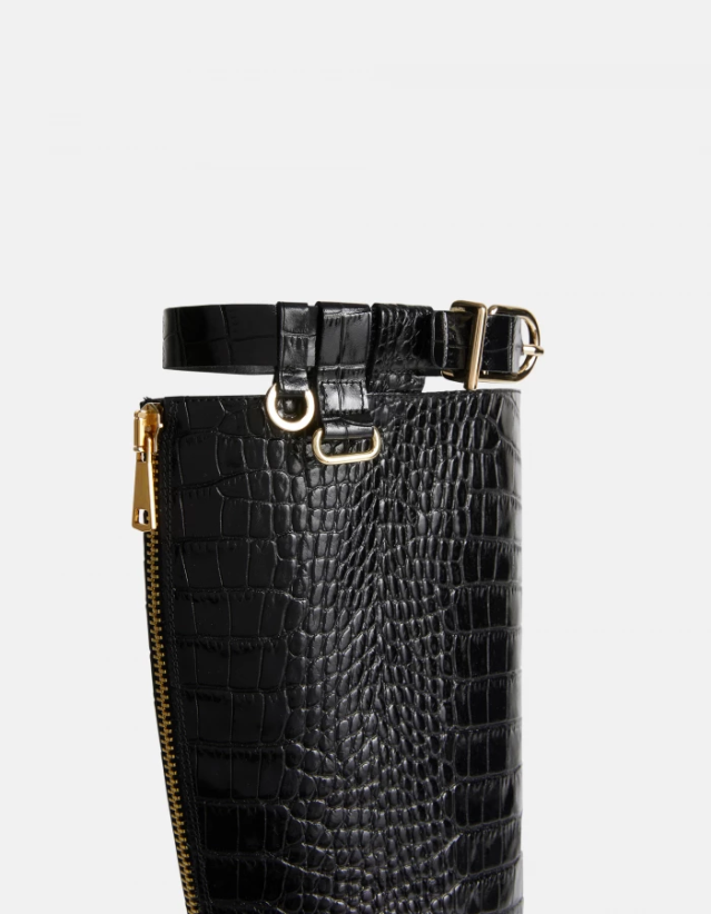 високе чизме са дебелим гуменим ђоном за тешке услове рада, округлим врхом, патентним затварачем позади, ременом са копчом у златној боји и омчама са прстеновима. ефекат крокодила.